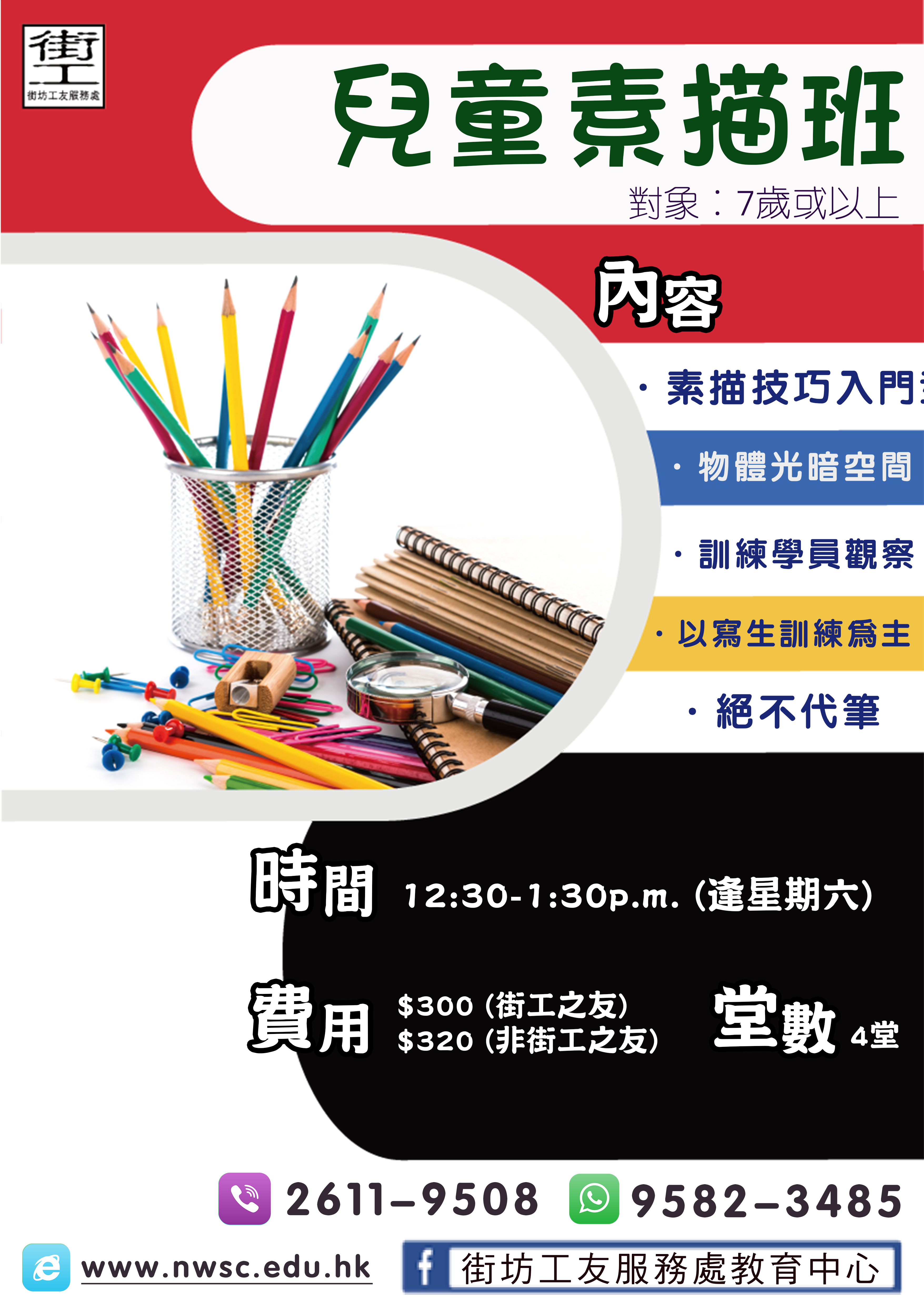 兒童素描班 keung2020-01-10T15:18:55+08:00 Project Description 課程名稱:兒童素描班 上課時間︰11:30-12:30pm (逢星期六) 上課中心:豪輝中心 (2611 9508) 費用:$300 (街工之友)、$320 (非街工之友) 堂數:4堂 課程內容 課程為素描技巧之入門課程,志在教授學員對於物體的光暗、立體、空間感、形態等,訓練及提高學員的觀察力。課程以循序漸進方式,以寫生訓練為主,著重基礎素描技巧。 課程對象 7歲或以上 備註 Share FacebookTwitterLinkedInGoogle +Email
