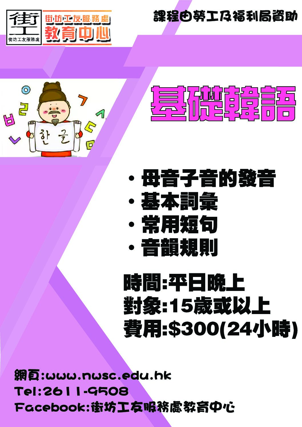 基礎韓語班 keung2025-02-20T15:50:12+08:00 Project Description 課程名稱:基礎韓語班 上課時間︰平日晚上 上課中心:豪輝中心 (2611 9508) 費用:$300 /共24小時 課程內容 教授韓文母音和子音的正確發音,同時透過基本詞彙和短句,令學員了解韓語各種音韻規則。 課程對象 15歲或以上香港居民 備註 #課程由勞工及福利局資助,出席八成以上可獲證書乙張 Share FacebookTwitterLinkedInGoogle +Email