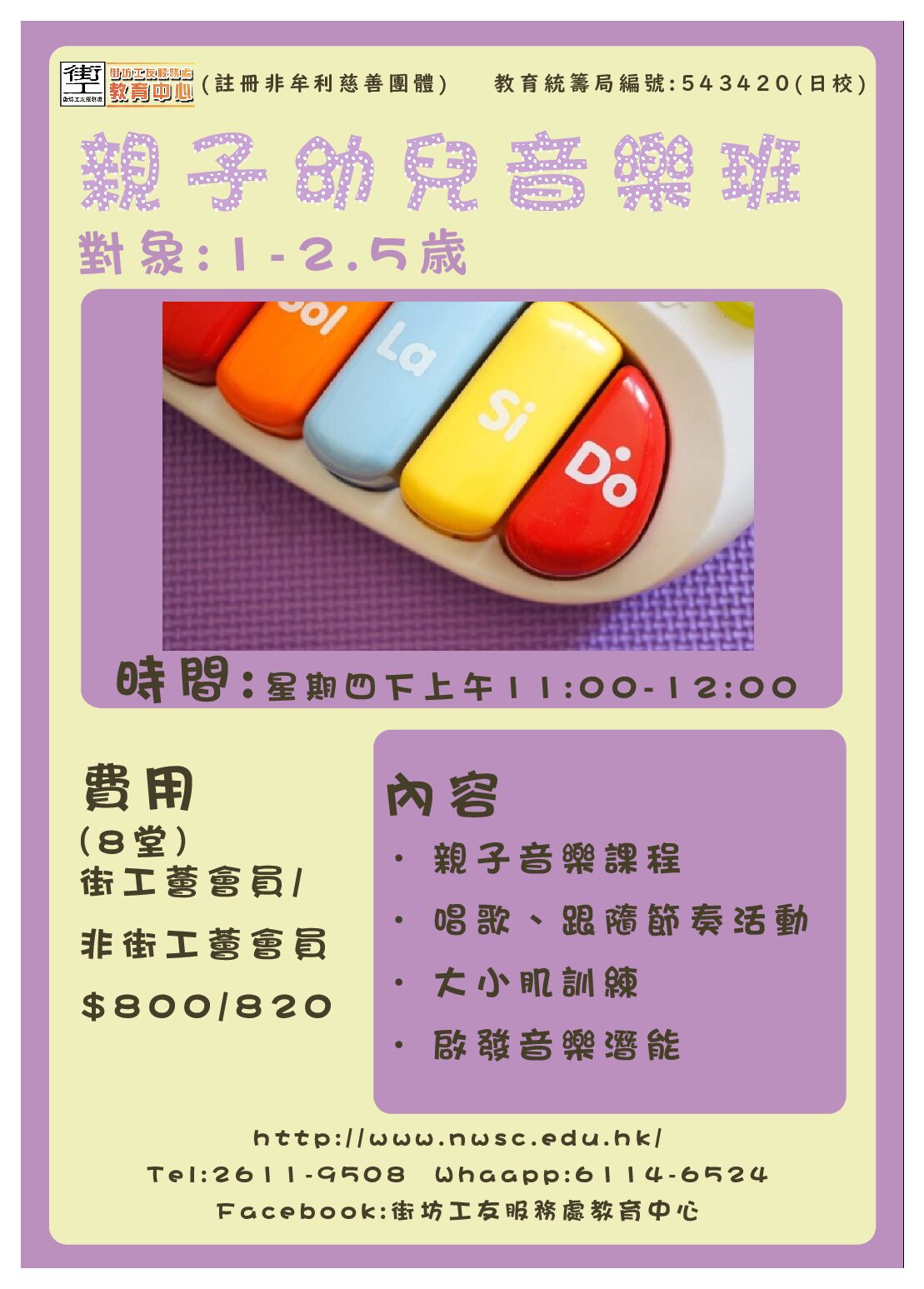 幼兒親子音樂啟蒙班 keung2025-02-20T16:48:14+08:00 Project Description 課程名稱:親子幼兒音樂啟蒙班 上課時間︰ 11:00-12:00 (逢星期四) 上課中心:豪輝中心 (2611 9508) 費用:$800(會員)、$820 (非會員) 堂數:8堂 課程內容 音樂為世界共通語言,即使是幼兒亦能隨著音樂擺動感受所帶來的益處。本課程透過不同的活動,如歌唱、律動、樂器探索等,讓幼兒及其家長一起體驗和欣賞音樂,啟發音樂潛能。 課程對象 1-2.5歲幼兒 備註 Share FacebookTwitterLinkedInGoogle +Email