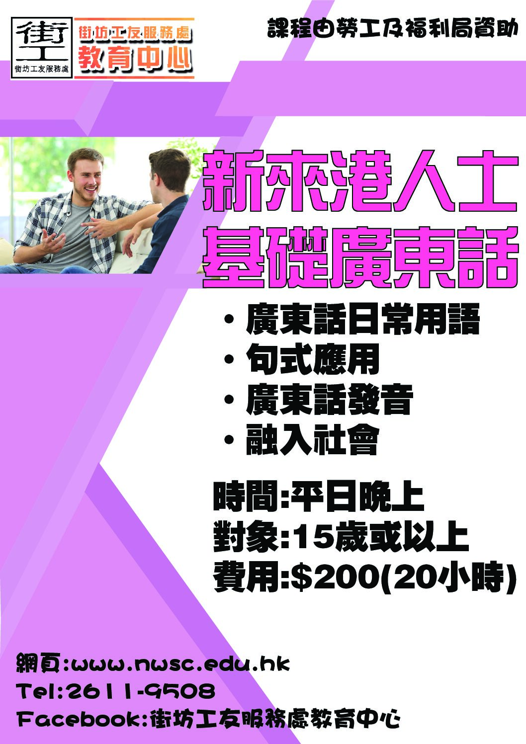 教授新移民人士廣東話日常用語,句子及發音,以協助新移民人士於日常生活中能夠運用適當的字詞及正確發音,藉此建立自信心並能融入社會。
