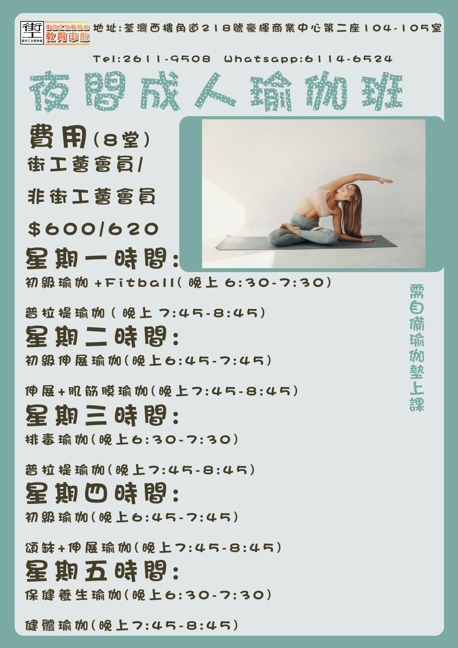 星期五時間:保健養生瑜伽( 晚上6 : 3 0 – 7 : 3 0 )