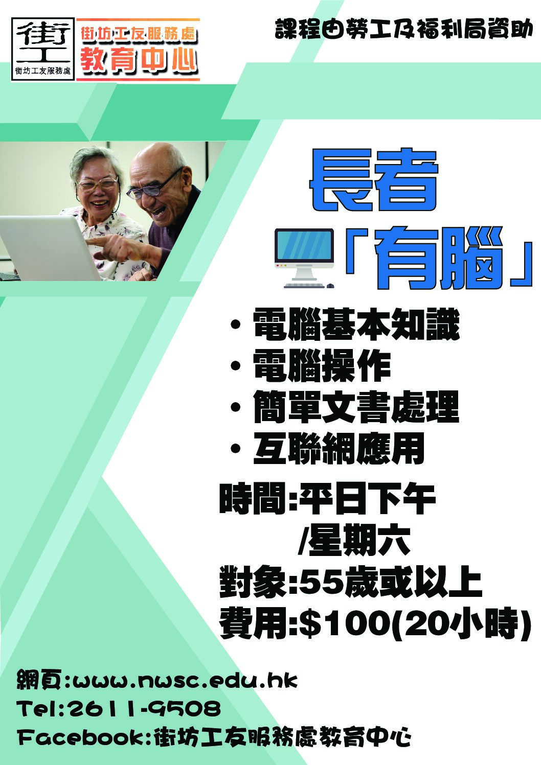 長者「有腦」班 keung2025-02-20T15:44:34+08:00 Project Description 課程名稱:長者「有腦」班 上課時間︰平日下午或星期六 上課中心:豪輝中心 (2611 9508) 費用:$100 /共20小時 課程內容 課程主要教授長者基本電腦知識及上網方法,讓他們能獨立操作電腦與時並進,老有所為。 課程對象 55歲或以上香港居民 備註 #課程由勞工及福利局資助,出席八成以上可獲證書乙張 Share FacebookTwitterLinkedInGoogle +Email