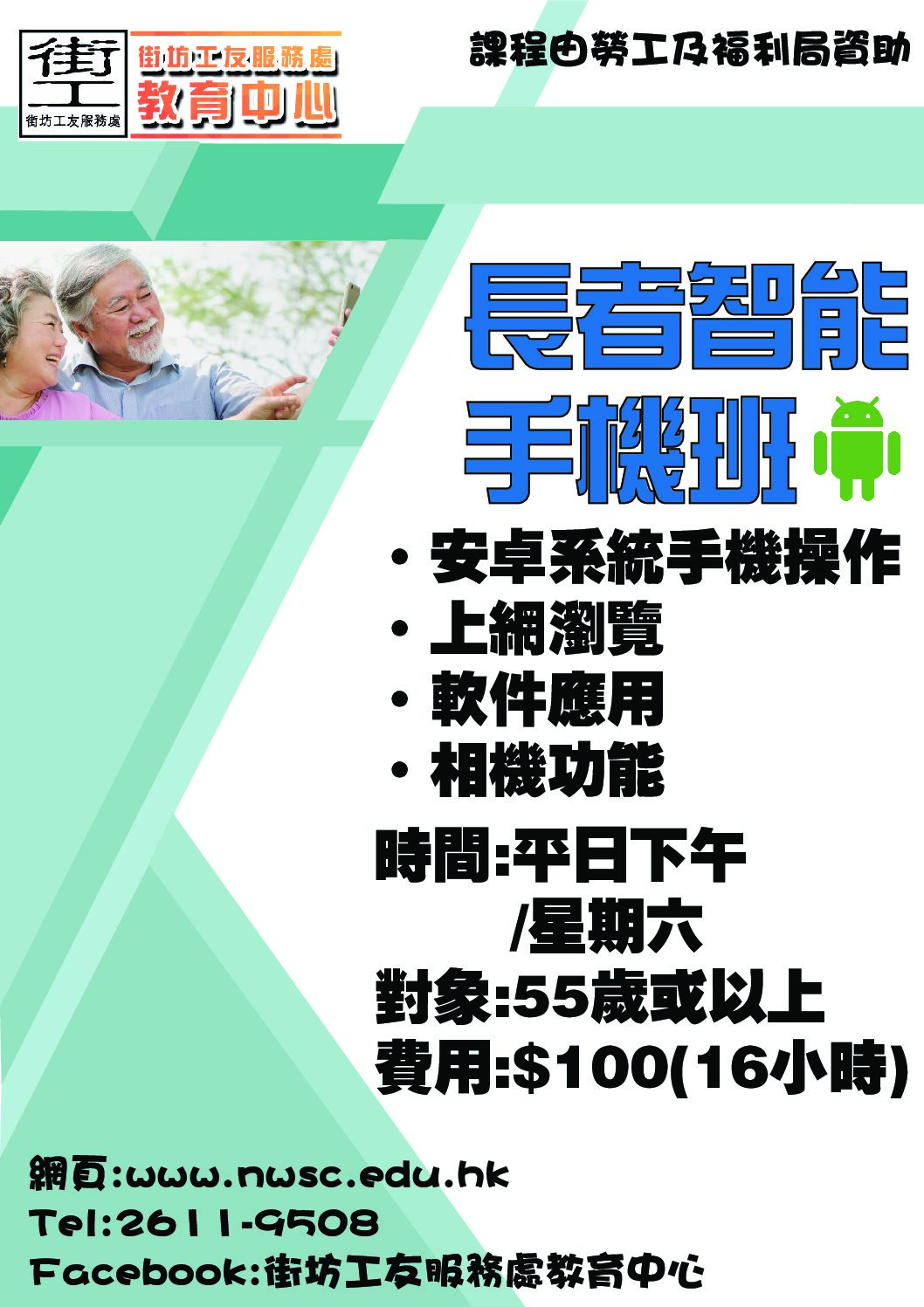 長者智能手機班 keung2025-02-20T15:48:42+08:00 Project Description 課程名稱:長者智能手機班 上課時間︰平日下午或星期六 上課中心:豪輝中心 (2611 9508) 費用:$100 /共16小時 課程內容 課程教授長者有關實際應用智能手機的知識,讓他們能夠利用智能電話享受現今科技帶來的方便,拉近與年輕一輩的距離。 課程對象 55歲或以上香港居民 備註 #課程由勞工及福利局資助,出席八成以上可獲證書乙張 Share FacebookTwitterLinkedInGoogle +Email